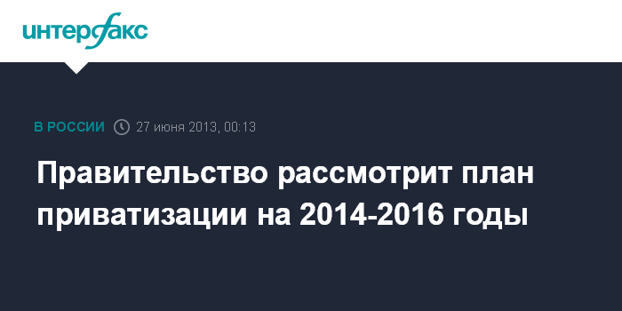 Москва. 27 июня. INTERFAX.RU - Правительство России на заседании в четверг рассмотрит вопрос о проекте прогнозного плана (программы) приватизации и основных направлениях приватизации федерального имущества на 2014 - 2016 годы, сообщили в пресс-службе кабинета министров.