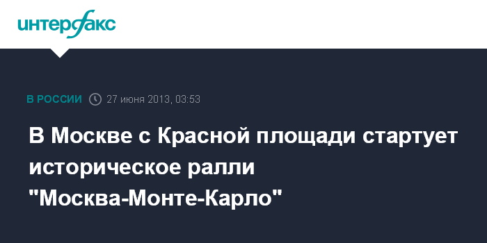 "От Васильевского спуска в 11:00 в четверг будет дан старт ралли "Москва-Монте-Карло". Ралли пройдет по маршруту Москва-Минск-Варшава-Берлин-Мюнхен-Лугано- Монте-Карло. 2 июля участники финишируют в Монако", - сообщил "Интерфаксу" один из организаторов ралли Станислав Кулешов.