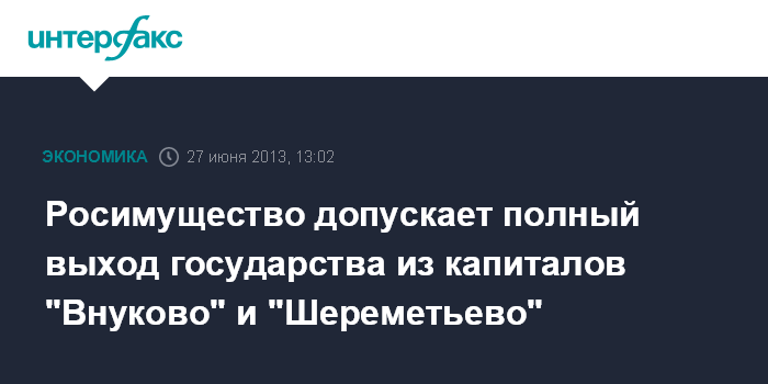 Москва. 27 июня. INTERFAX.RU - Росимущество допускает полный выход государства из капиталов аэропортов "Внуково" и "Шереметьево", заявила замминистра экономического развития - руководитель Росимущества Ольга Дергунова журналистам в четверг в Москве.