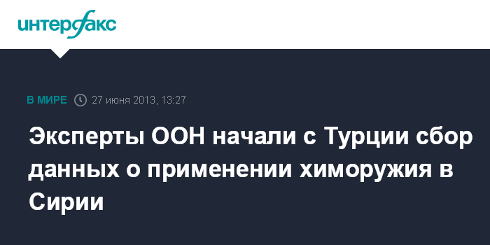 Стамбул. 27 июня. INTERFAX.RU - Группа инспекторов ООН находится в Турции и изучает данные о возможном применении химического оружия в Сирии, сообщают в четверг турецкие СМИ со ссылкой на источники в Анкаре.