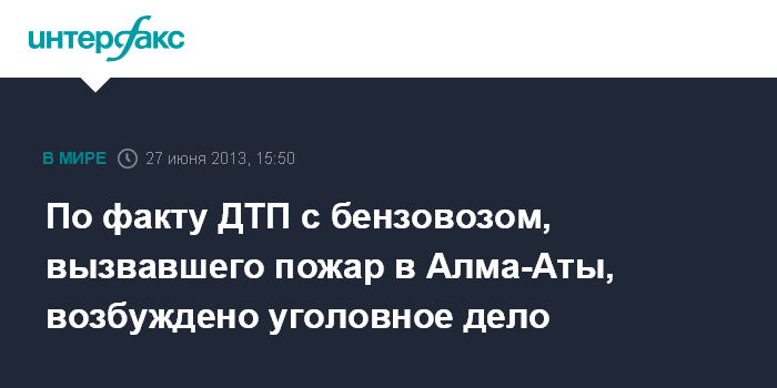 Алматы. 27 июня. INTERFAX.RU - Департамент внутренних дел Алматы возбудил уголовное дело по факту ДТП, вызвавшего крупный пожар в центре города, в результате которого сгорели несколько автомобилей и повреждены квартиры восьмиэтажного дома.