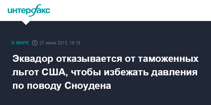 "Эквадор отказывается в одностороннем порядке от льготных таможенных условий со стороны США", - сказал министр. По его словам, "подобное решение принято, чтобы США не могли использовать это соглашение как инструмент давления на Эквадор при принятии решения о предоставлении политического убежища Эдварду Сноудену".