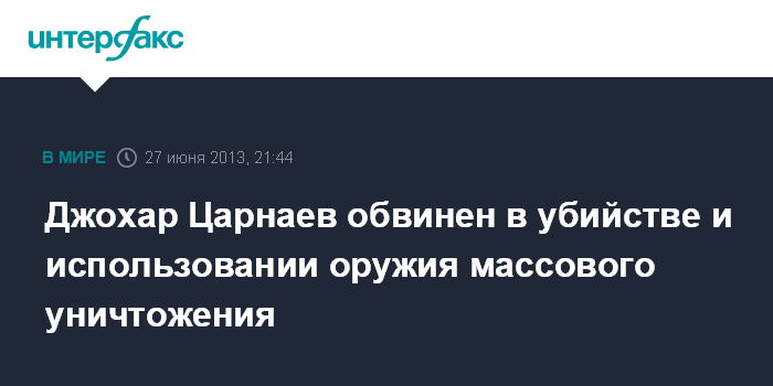 Вашингтон. 27 июня. INTERFAX.RU - Прокуратура США в четверг признала организатора взрывов на бостонском марафоне Джохара Царнаева виновным в убийстве четверых человек и использовании оружия массового уничтожения.