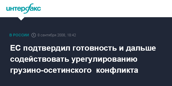 Москва. 8 сентября. INTERFAX.RU - Евросоюз подтвердил готовность и дальше содействовать разрешению грузино-осетинского конфликта, заявил президент РФ Дмитрий Медведев.