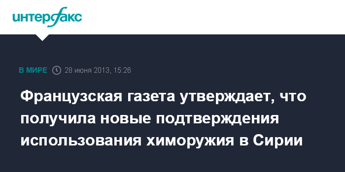 Париж. 28 июня. ИНТЕРФАКС - Новые лабораторные анализы позволили определить, что сирийские военные действительно применяли химоружие против мятежников, пишет в пятницу парижская газета Le Monde.