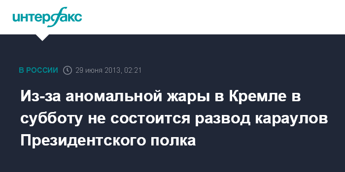 Москва. 29 июня. ИНТЕРФАКС - Церемония развода конных и пеших караулов Президентского полка в Московском Кремле в субботу, 29 июня, отменяется из-за аномально жаркой погоды, установившейся в столице, сообщил "Интерфаксу" официальный представитель ФСО Сергей Девятов.