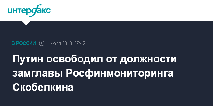 Москва. 1 июля. INTERFAX.RU - Президент России Владимир Путин освободил от должности замруководителя Федеральной службы по финансовому мониторингу Дмитрия Скобелкина.