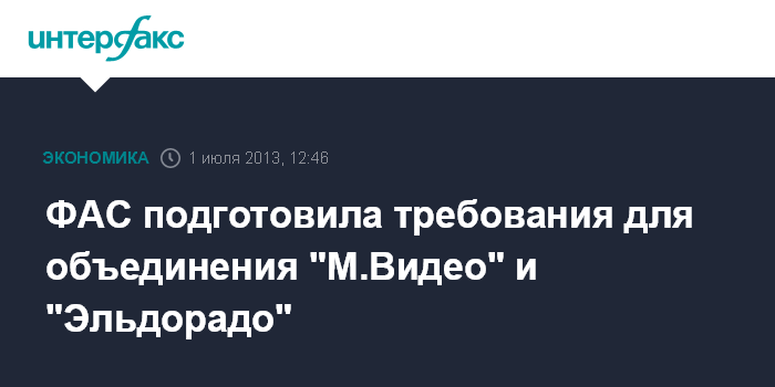 Москва. 1 июля. INTERFAX.RU - Федеральная антимонопольная служба (ФАС) подготовила структурные требования, в случае исполнения которых ведомство даст согласие на объединение "М.Видео" и "Эльдорадо", сообщил заместитель главы ФАС Андрей Кашеваров журналистам в понедельник.