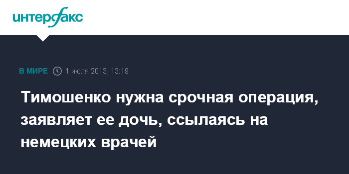 Харьков. 1 июля. INTERFAX.RU - Экс-премьер Юлия Тимошенко нуждается в срочном проведении операции, сообщила дочь экс-премьера Юлии Тимошенко Евгения, ссылаясь на рекомендации немецких врачей из клиники "Шарите".