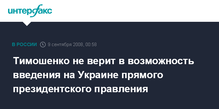 Киев. 9 сентября. ИНТЕРФАКС-УКРАИНА - Введение прямого президентского правления на Украине противоречило бы конституции страны, заявила премьер-министр Юлия Тимошенко и добавила, что не верит в возможность реализации такого сценария.