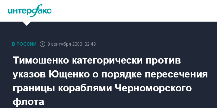 Киев. 9 сентября. ИНТЕРФАКС-УКРАИНА - Премьер-министр Украины Юлия Тимошенко называет указы президента Виктора Ющенко о порядке пересечения границы кораблями Черноморского флота РФ противоречащими соглашению между Украиной и Россией о базировании ЧФ на территории Украины.