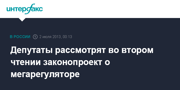 Москва. 2 июля. INTERFAX.RU - Госдума на заседании во вторник рассмотрит во втором чтении законопроект о мегарегуляторе.