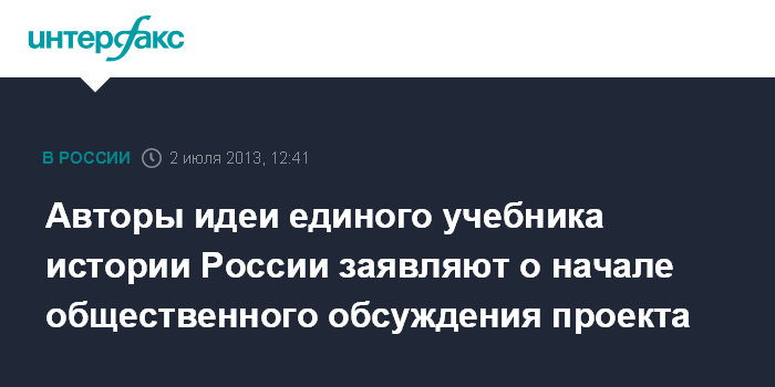 Москва. 2 июля. INTERFAX.RU - Обсуждение концепции единого школьного учебника истории стартовало в интернете, текст предлагаемого документа опубликован на федеральном портале "История.рф".