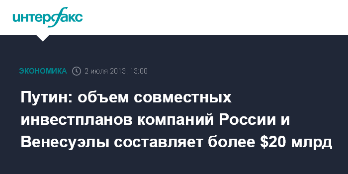 Москва. 2 июля. INTERFAX.RU - Совместные инвестиционные планы российских и венесуэльских компаний превышают $20 млрд, все они реализуются, заявил президент России Владимир Путин.