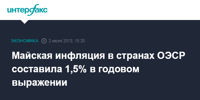 2 июля. FINMARKET.RU - Средняя инфляция в годовом выражении в странах, входящих в Организацию экономического сотрудничества и развития (ОЭСР), в мае 2013 года ускорилась до 1,5% против 1,3% в апреле, говорится в сообщении организации.