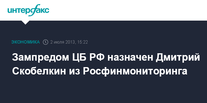 Москва. 2 июля. INTERFAX.RU - Заместителем председателя Банка России с 5 июля 2013 г. назначен Дмитрий Скобелкин, говорится в сообщении департамента внешних и общественных связей Банка России.