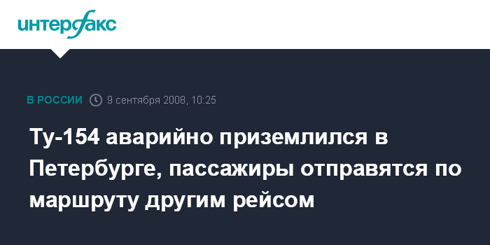 Москва. 9 сентября. INTERFAX.RU - Самолет Ту-154 авиакомпании ГТК "Россия" во вторник утром совершил посадку в аэропорту "Пулково" после возникшей в небе над Петербургом внештатной ситуации, сообщили "Интерфаксу" в Северо-Западном УВД на транспорте.