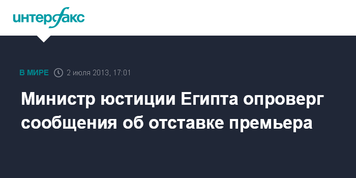 Дубай. 2 июля. INTERFAX.RU - Министр юстиции Египта Ахмад Мухаммад Сулейман назвал ложными сообщения о том, что глава правительства Хишам Кандиль подал в отставку, сообщает во вторник межарабский телеканал Al Arabiya.