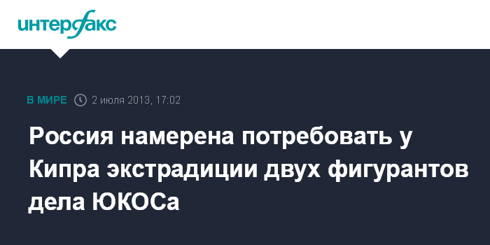 Москва. 2 июля. INTERFAX.RU - Российские власти намерены направить на Кипр новый запрос о выдаче двух фигурантов "большого дела ЮКОСа", заочно осужденных на родине.