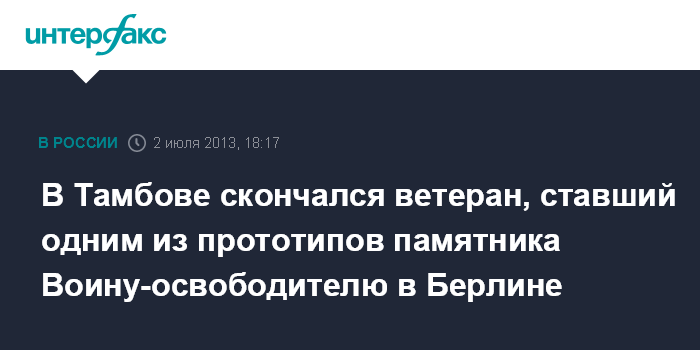 Тамбов. 2 июля. INTERFAX.RU - В Тамбове на 87-м году жизни скончался Иван Одарченко - ветеран Великой Отечественной войны, ставший прототипом памятника Воину-освободителю в берлинском Трептов-парке, сообщает во вторник пресс-служба администрации Тамбовской области.