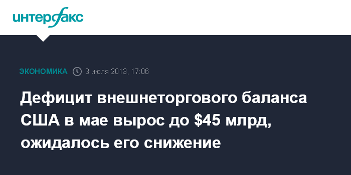 3 июля. FINMARKET.RU - Дефицит внешнеторгового баланса США в мае 2013 года вырос на 12,1% - до $45 млрд, максимального значения с ноября прошлого года, свидетельствуют данные министерства торговли страны.