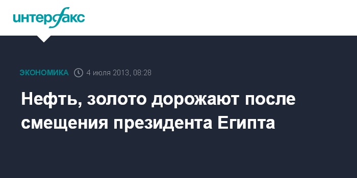 Москва. 4 июля. INTERFAX.RU - Цены на нефть и золото растут после отстранения военными со своего поста президента Мухаммеда Мурси и назначения главой государства в переходный период руководителя Конституционного суда страны.