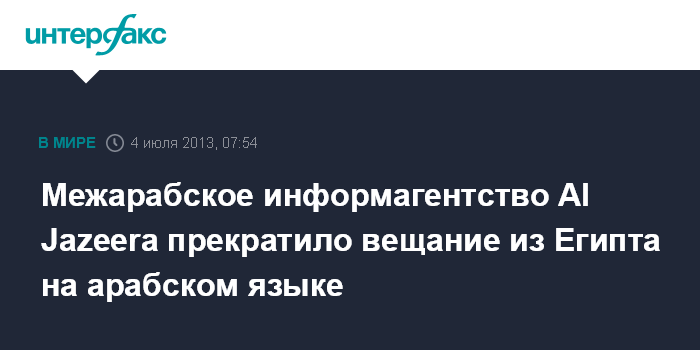 Каир. 4 июля. INTERFAX.RU - Телевизионная служба информационного агентства "Аль-Джазира" прекратила вещание на арабском языке из Каира.