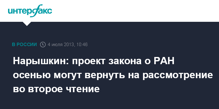 Москва. 4 июля. INTERFAX.RU - Председатель Госдумы Сергей Нарышкин заявил, что законопроект о реформе РАН может быть осенью возвращен во второе чтение для внесения поправок по итогам предстоящего обсуждения этого документа.