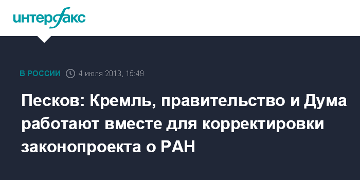 Песков: Кремль, правительство и Дума работают вместе для корректировки законопроекта о РАН