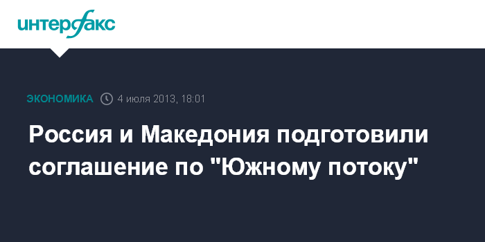 Москва. 4 июля. INTERFAX.RU - Россия и Македония подготовили межправительственное соглашение о сотрудничестве в строительстве в республику отвода от газопроводной системы "Южный поток". Премьер-министр РФ Дмитрий Медведев 2 июля своим распоряжением утвердил текст документа.