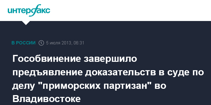Владивосток. 5 июля. ИНТЕРФАКС - ДАЛЬНИЙ ВОСТОК - На процессе по делу так называемых "приморских партизан", который проходит в Приморском краевом суде во Владивостоке, в пятницу начинает представлять доказательства сторона защиты.