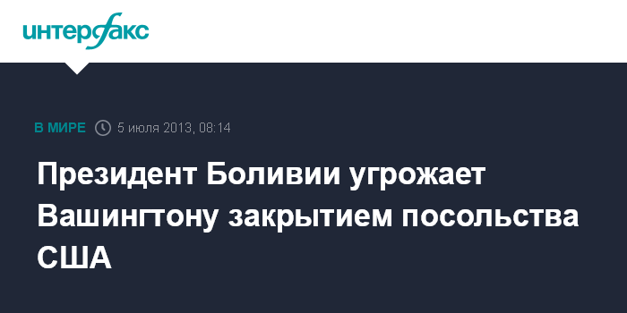 "Мы изучим (ситуацию - ИФ), и если надо, закроем посольство США в Боливии", - заявил глава государства. "Нам не нужно американское посольство в Боливии. У меня не дрогнет рука закрыть его. У нас есть достоинство, суверенитет. Без США нам будет лучше и в области политики, и в области демократии", - сказал он в ночь на пятницу по московскому времени.