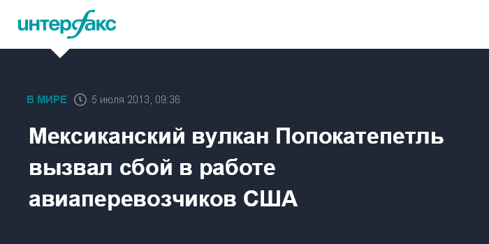Мехико. 5 июля. INTERFAX.RU - Американские авиакомпании American Airlines, US Airways, Delta Airlines, Alaska Airlines и Spirit Airlines отменили за последние сутки 47 авиарейсов между Мексикой и США в связи с извержением вулкана Попокатепетль, сообщил представитель аэропорта Мехико.