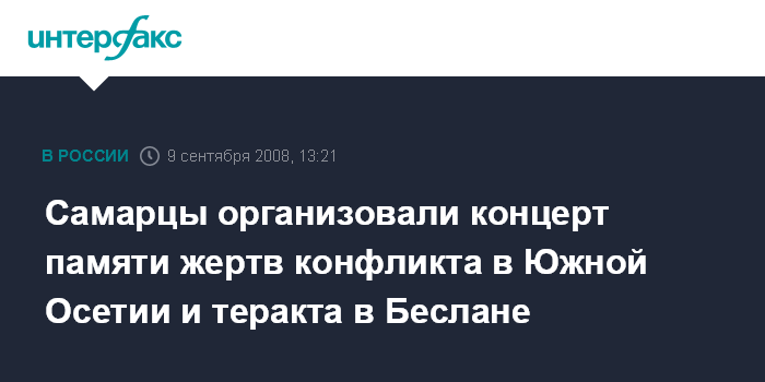 Москва. 9 сентября. INTERFAX.RU - Во вторник в Самаре пройдет благотворительный концерт, посвященный памяти жертв югоосетинского конфликта, а также погибших во время теракта в Беслане.