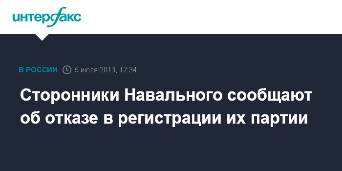 Москва. 5 июля. INTERFAX.RU - Партии сторонников и коллег оппозиционера Алексея Навального отказано в регистрации, утверждает член оргкомитета "Народного альянса" Леонид Волков.