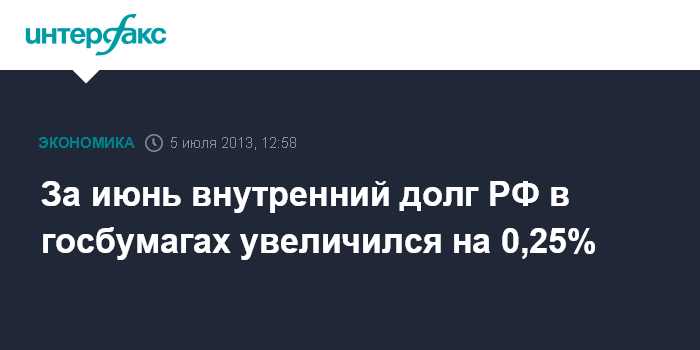 За июнь внутренний долг РФ в госбумагах увеличился на 0,25%