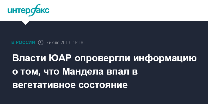 Йоханнесбург/Лондон. 5 июля. INTERFAX.RU - Власти ЮАР в пятницу назвали не соответствующими действительности сообщения, согласно которым экс-президент ЮАР Нельсон Мандела пребывает в вегетативном состоянии.