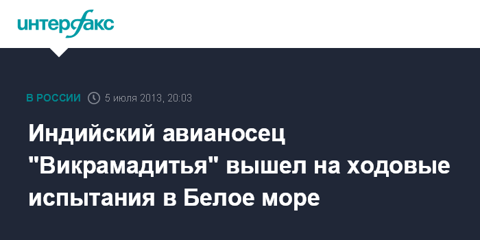 Санкт-Петербург. 5 июля. INTERFAX.RU - Северодвинский "Севмаш" вместе с ВМФ России и ВМС Индии в пятницу приступил к ходовым испытаниям в Белом море индийского авианосца "Викрамадитья" (бывший "Адмирал Горшков"), сообщил журналистам генеральный директор "Севмаша" (входит в состав Объединенной судостроительной корпорации) Михаил Будниченко.