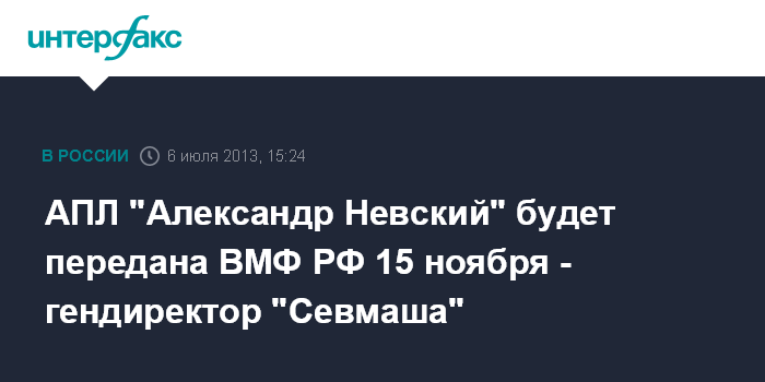 Санкт-Петербург. 6 июля. INTERFAX.RU - Атомный ракетный подводный крейсер стратегического назначения "Александр Невский" проекта 955 "Борей" будет передан ВМФ России 15 ноября, до этого в сентябре он выполнит стрельбу межконтинентальной баллистической ракетой (МБР) "Булава", сообщил в субботу в ходе 6-го Международного военно-морского салона гендиректор северодвинского "Севмаша" (входит в состав Объединенной судостроительной корпорации) Михаил Будниченко.