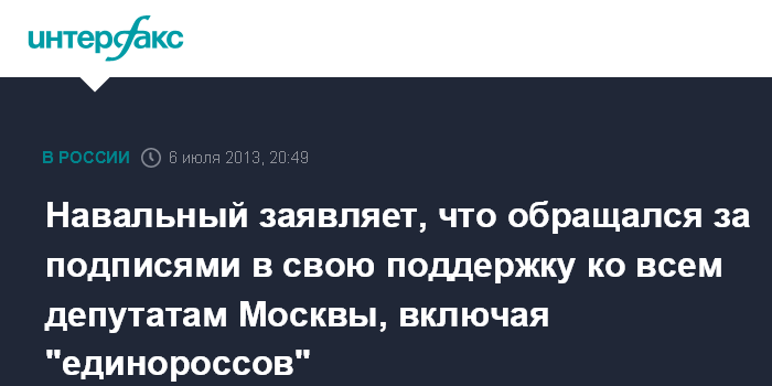 Ранее секретарь политсовета Московского городского отделения "Единой России" Ирина Белых заявила журналистам, что А.Навальный высказал желание получить подписи депутатов от "Единой России" для выдвижения в кандидаты мэра Москвы.