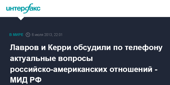 Москва. 6 июля. ИНТЕРФАКС - Глава МИД РФ Сергей Лавров и госсекретарь США Джон Керри обсудили по телефону актуальные вопросы российско-американских отношений, сообщили в субботу в российском внешнеполитическом ведомстве.