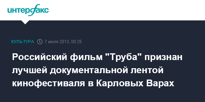 Москва. 7 июля. ИНТЕРФАКС - Российский документальный фильм "Труба" назван лучшей документальной лентой 48-го международного кинофестиваля в Карловых Варах, сообщил в субботу "Интерфаксу" режиссер фильма Виталий Манский.