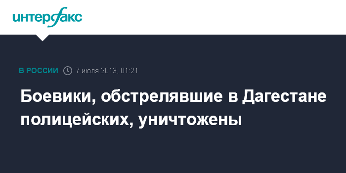 Ростов-на-Дону/Махачкала. 7 июля. ИНТЕРФАКС-ЮГ - Двое боевиков, совершивших вооруженное нападение на полицейский наряд в Буйнакске, уничтожены, сообщили агентству "Интерфаксу-Юг" в пресс-службе МВД по Дагестану в воскресенье.