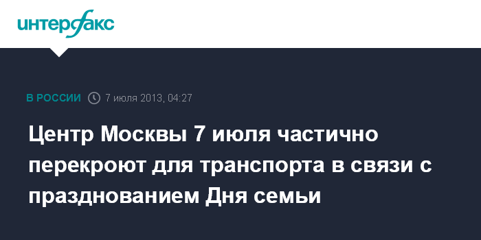 Центр Москвы 7 июля частично перекроют для транспорта в связи с празднованием Дня семьи