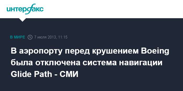 Вашингтон. 7 июля. INTERFAX.RU - Экипаж самолета Boeing 777, совершившего жесткую посадку в аэропорту Сан-Франциско, при снижении не мог использовать систему навигации Glide Path, передают в воскресенье американские СМИ. По их данным, в аэропорту на время отключили эту систему.