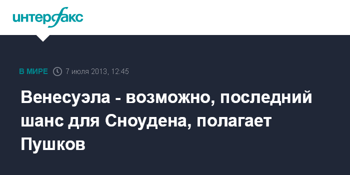 Москва. 7 июля. INTERFAX.RU - Глава комитета Госдумы по международным делам Алексей Пушков считает, что наилучшим исходом и вероятно, последним шансом для бывшего сотрудника ЦРУ Эдварда Сноудена стало бы предоставление ему политического убежища Венесуэлой. "Венесуэла ждет ответа от Сноудена. Это, возможно, его последний шанс получить политич. убежище. Иначе ему останется жениться на Анне Чапман", - написал в своем Twitter в воскресенье А.Пушков.