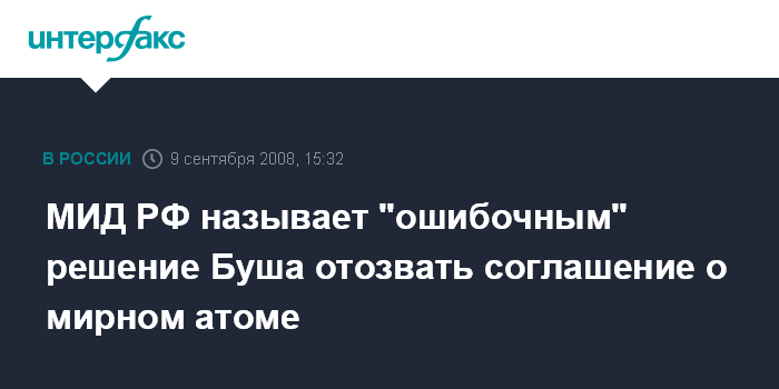 "Решение президента США Джожджа Буша отозвать из Конгресса США внесенное на ратификацию российско-американское соглашение о мирном ядерном сотрудничестве мы оцениваем как ошибочное и политизированное. Недоумение вызывает у нас и момент, выбранный для объявления этого решения", - говорится в сообщении для СМИ, размещенном на сайте МИД РФ.