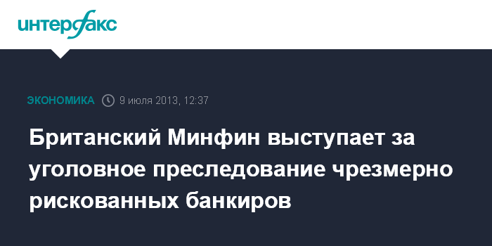 Лондон. 9 июля. INTERFAX.RU - Министерство финансов Великобритании предложило принять закон об уголовном преследовании и возможности тюремного заключения топ-менеджеров ведущих банков за "безрассудное поведение" - принятие чрезмерных рисков, угрожающих стабильности самой компании и отрасли в целом, пишет The Wall Street Journal.