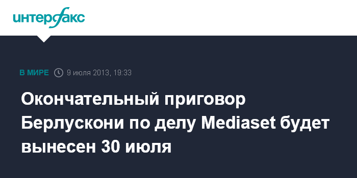 Рим. 9 июля. INTERFAX.RU - Верховный кассационный суд Италии определил 30 июля датой рассмотрения так называемого дела Mediaset, фигурантом которого является бывший итальянский премьер Сильвио Берлускони, сообщает во вторник миланская газета "Коррьере дела сера".