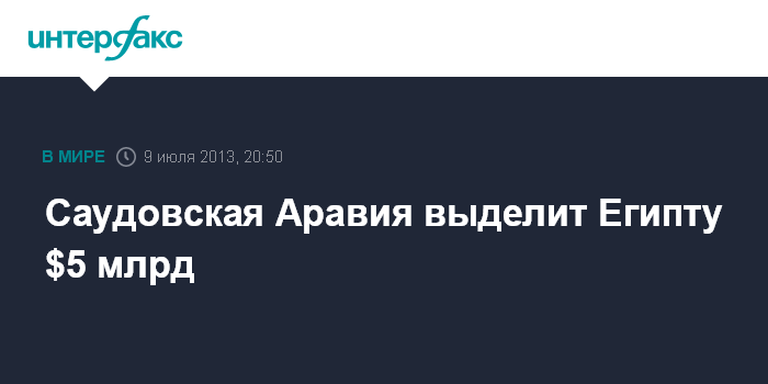 Дубай. 9 июля. INTERFAX.RU - Власти Саудовской Аравии намерены предоставить Египту помощь на сумму $5 млрд, сообщает во вторник межарабский телеканал "Аль-Арабийя".